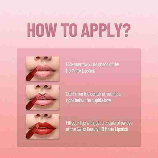 About this item Richly pigmented and high-impact colours make your lips stand out with a single swipe. The creamy formulation blends evenly across your lips, providing complete coverage that wears comfortably. Swiss Beauty's HD Matte Lipstick is non-drying, so it gives you a second-skin feel that hydrates and nourishes your lips. This versatile lipstick glides like butter and instantly plumps up your lips, creating a soft, supple finish that blurs the appearance of lip lines. Available in a covetable lineup of shades suitable for all skin tones, this lightweight lipstick is perfect for any occasion, from day to night.